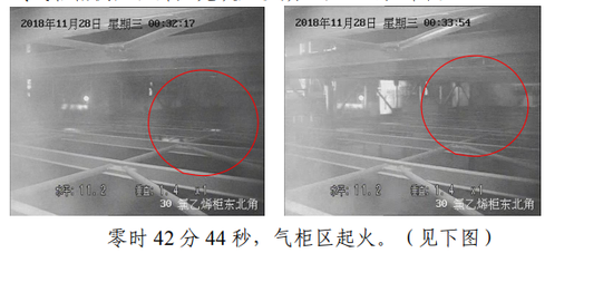 調取氣柜東北角的監控視頻(視頻時間比北京時間慢7分2秒),顯示1#氯乙烯氣柜發生過大量泄漏;零時40分55秒觀察到氣柜南側廠區外火光映入視頻畫面。(見下圖)