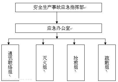 成立安全生產事故應急指揮部(以下簡稱“指揮部”),下設應急辦公室,設在 。結合本單位實際情況,設置通訊聯絡組、滅火組、疏散組、搶救組4個應急救援組。