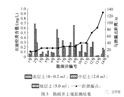 對重污染區域開挖區內泄漏點進行采樣監測分析,可知開挖區土壤石油烴類指標濃度為223 mg/kg,地下水石油類指標濃度為329 mg/L。且根據圖2可知,距離泄漏點越遠,地下水石油類濃度越低,參考 GB 5749-2006中石油類標準限值(0.3 mg/L),泄漏點開挖區地下水濃度超標了1095倍,這主要是由于受污染土壤與地下水接觸后,石油類物質進入地下水,導致石油類超標嚴重。2號、6號井石油類濃度為0.45~0.48 mg/L,超標0.5~0.6倍,受到輕微污染。其余井地下水石油類濃度均為0.1~0.3 mg/L,屬達標。其中背景點14號井地下水石油類為0.09 mg/L。