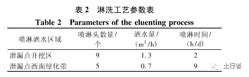 噴淋灑水區域選定為泄漏點開挖區及周邊區域綠化帶,噴淋灑水區域內布設自來水管道及噴淋頭,噴淋頭覆蓋面積直徑>2 m,灑水量>0.1 m3/h,輸水管安裝水表記錄灑水量。