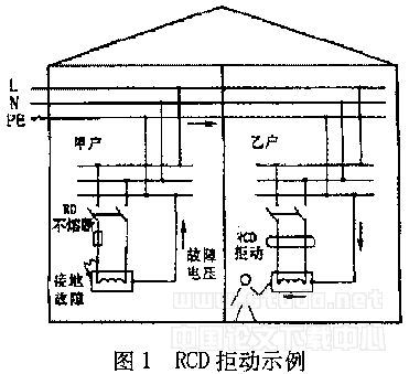 RCD對接地故障電流有很高的靈敏度,能在數(shù)十毫秒的時(shí)間內(nèi)切斷以毫安計(jì)的故障電流,即使接觸電壓高達(dá)220V,高靈敏度的RCD也能快速切斷使人免遭電擊的危險(xiǎn),這是眾所周知的。但RCD只能對其保護(hù)范圍內(nèi)的接地故障起作用,而不能防止從別處傳導(dǎo)來的故障電壓引起的電擊事故,見圖1。