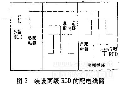 圖3中為某一住宅樓,每戶配電箱的插座回路裝一普通型的RCD,用于防火的S型RCD只在全樓電源總進(jìn)線上安裝。對大型電氣裝置可再加一級(jí)RCD,其In值和切斷時(shí)間可以視具體情況確定。