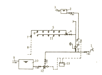 1—水泵接合器;2—高位水箱;3—進水管;4—雨淋閥;5—傳動管;6—閉式噴頭;7—手動閥;8—排水管;9—進水和;10—水池;11—開式噴頭;12—消防泵,13—控制箱