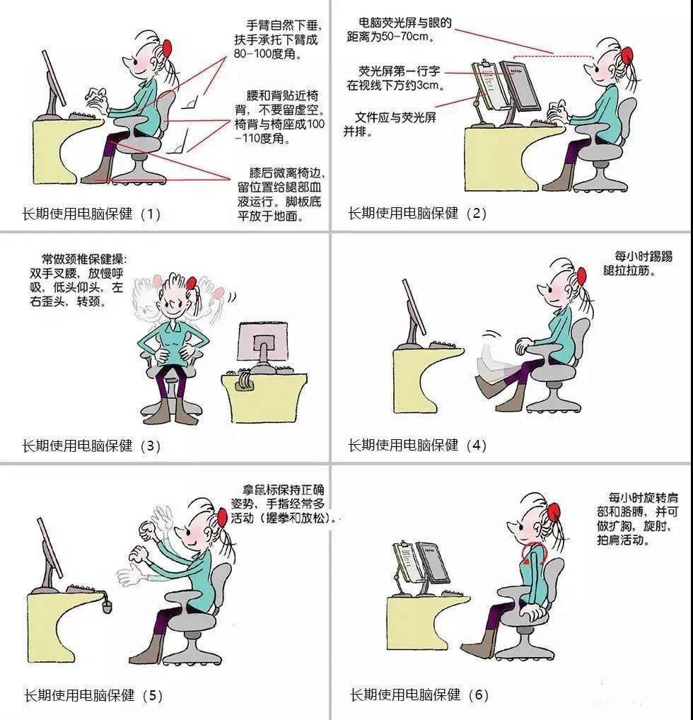 電腦已成為辦公室工作的重要工具。長時(shí)間使用電腦,容易造成眼睛疲勞,手腕、手臂、肩膀、頸部和背部的肌肉、肌腱和神經(jīng)損傷。