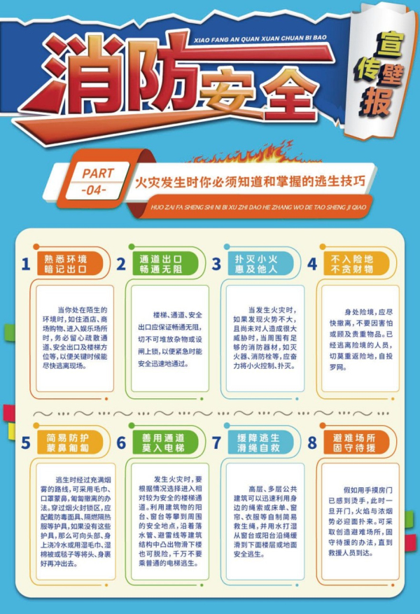 消防安全宣傳壁報掛圖的內容涵蓋了消防安全的各個方面,如“如何正確使用滅火器”、“火災逃生技巧”、“容易發生火災事故的原因”等。通過采用鮮艷的色彩和生動的圖像,同時,配以簡潔明了的文字知識,使公眾和企業員工能夠迅速理解并記住所宣傳的消防安全知識。通常張貼在公共場所、小區報欄畫廊、工礦企業等行人較多的地方,以便公眾隨時觀看和學習。