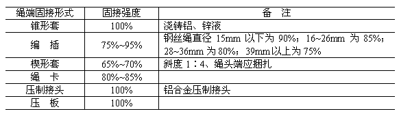 注:“固接強度”是指鋼絲繩固定部位承受的拉力相當于鋼絲繩破斷拉力的百分數。