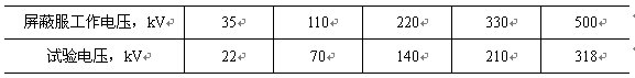 b. 在場強(qiáng)表探頭分別置于屏屏服帽子下頭頂處及屏蔽服的內(nèi)胸前、背后等3處位置的情況下,按規(guī)定使用電壓等級,在模擬導(dǎo)線上施加最高運(yùn)行相電壓(試驗(yàn)電壓標(biāo)準(zhǔn)見下表),然后用望遠(yuǎn)鏡分別讀取3個數(shù)據(jù);