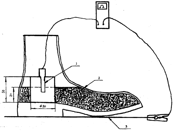 對裝有分流連接線的鞋子,將鞋子平放在平板電極上,其內(nèi)裝入直徑為4mm的鋼珠達(dá)20mm深,可以發(fā)流連接線與平板電極之間測量電阻。