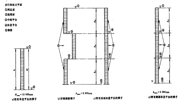 到達面、起程面分別與最接近的平臺之間的梯段或相鄰兩休息平臺之間的梯段(見圖1b、圖1c)高度h應不大于6m。