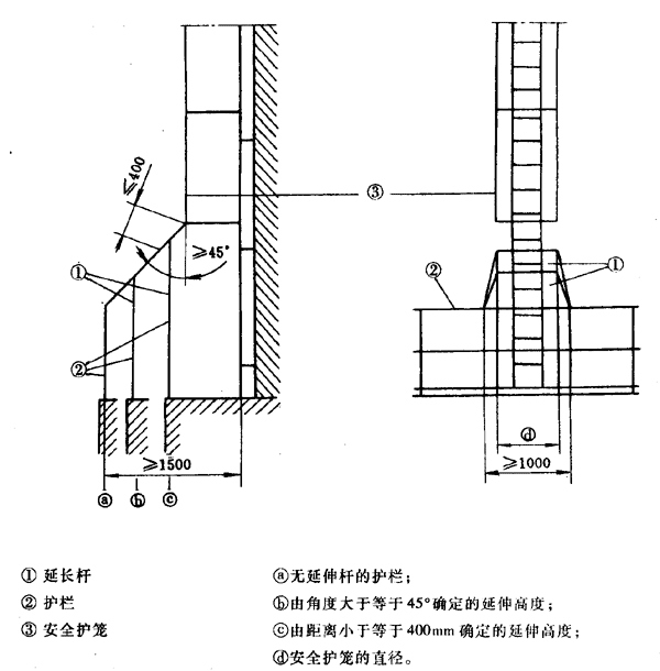 在梯子的兩邊至到達面護欄的扶手之間應安裝斜扶手,該斜扶手起始于倒數第二級踏棍的位置(見圖11)。