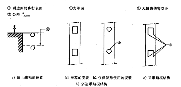 如果需要,通過機器或周圍環境的安排使兩相繼的梯段可以是相鄰的,而沒有分離的平臺(見圖5)。在這種情況下,下面的梯段應延伸至休息平臺以上至少2200mm,以為梯子的使用者提供良好的扶手(見圖12)。