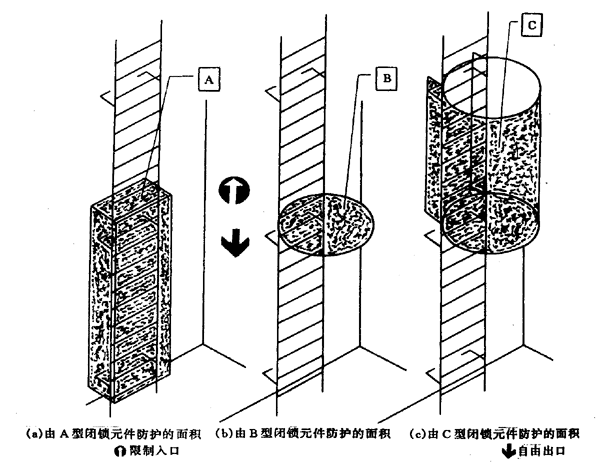 當危險區包括幾個進出口時,所有的閉鎖都應裝有緊急開啟裝置。