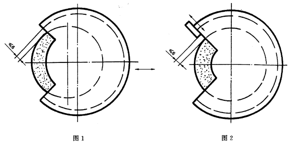 3.1.4 對于操作位置在砂輪防護罩前方的外圓磨床機床,其防護罩的圓周板應設有隨砂輪變小而調整的機構。例如通過移動砂輪防護罩(見圖1)或安裝可調護板(見圖2)達到。可調護板的安裝必須保證牢固可靠。砂輪圓周表面與防護罩可調護板之間的距離,或是與防護罩開口的上端邊緣之間的距離一般應可調整至6mm以下。