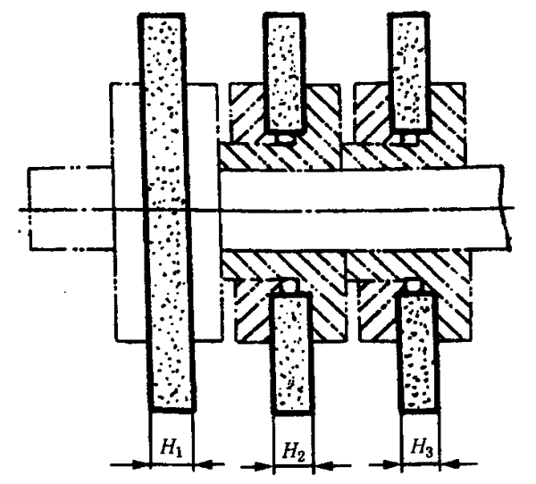 b)采用圖5方法安裝砂輪時,其砂輪厚度等于各砂輪厚度之和(H=H1+H2+H3,見圖5)。
