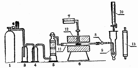 1—氧氣瓶;2—氧氣表;3—緩沖瓶;4—洗氣瓶;5—干燥塔;6—管式爐;7—可控硅溫度自動控制器(或調壓器);8—球形干燥管;9—吸收杯;10—滴定管;11—瓷管;12—帶瓷蓋的瓷舟;13—日光燈(8瓦)