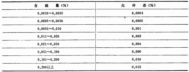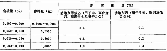 ③需用經重量法或還原一比色法定值,牌號相似,含硫量相近的標準試樣。測定0.010%以下的硫時,亦可采用稱取0.1000克含硫量大于0.010%的標樣和0.9000克含硫量小于0.001%的標樣混合后進行標定??瞻字祽ù芍?,瓷蓋,助熔劑及0.9克含硫量小于0.001%的標樣。