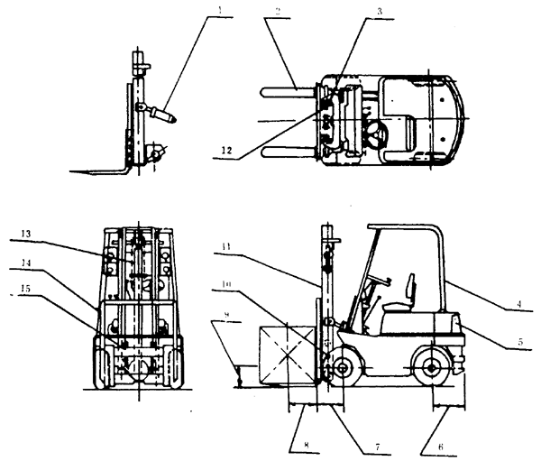 1―傾斜油缸;2―貨叉;3―縱向滾輪;4―護頂架;5―平衡重;6―后懸距;7―前懸距;8―載荷中心距;9―自由起升高度;10―側輪;11―門架;12―貨叉架;13―起升油缸;14―擋貨架;15―貨叉梁