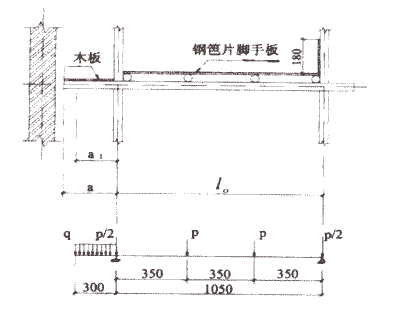 1.3 本設(shè)計(jì)中所采用的腳手板為深圳地區(qū)使用較為廣泛的鋼笆片,其自重標(biāo)準(zhǔn)值為0.125kN/m2。具體做法是(如圖2),在兩立桿間的橫向水平桿上等距設(shè)置四根縱向水平桿,將鋼笆片用鉛絲固定在這四根縱向水平桿上。橫向水平桿的外伸部分采用木腳手板,其自重標(biāo)準(zhǔn)值為0.35kN/m2。