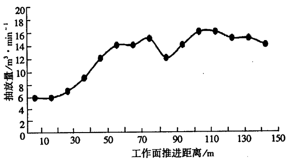 2622(3)工作面開始回采第3日即開始抽放,在40m處(老頂未冒落之前)抽放濃度為15%~20%,抽放流量為6~9 m3/min,抽放率為40%,工作面回風流的瓦斯濃度為0.5%~0.6%;當工作面推進超過高抽巷40m(即老頂冒落后),高抽巷抽放量明顯增加,抽放濃度為30%~50%,抽放流量為12~16 m3/min,抽放率在50%以上,工作面回風流的瓦斯濃度為0.5%~0.7%,有效地解決了工作面初采及正常回采期間的瓦斯問題。高抽蒼的抽放量隨推進距離的變化曲線如圖2所示。