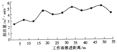 工作面開始回采第2d尾抽巷即開始抽放。在工作面回采初期的50m(老頂未冒落前),抽放流量一直保持在4~6 m3/min ,抽放率達50%以上,保證了工作面的安全生產。