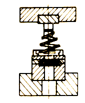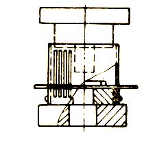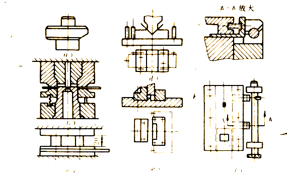 (6) 在裝有活動擋料銷和固定卸料板的大型模具上,用凸輪或斜面機械控制擋料銷的位置(圖10f)。