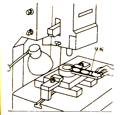 如圖11所示是沖制碗形零件類采用的手工簡易送料裝置。將凹模的上平面切去寬度稍大于坯料直徑、深度為2mm的送料槽,并加裝固定導板,導板長度上可放2~3個坯料。操作時,只要用手推動坯料,使坯料沿著導板滑入凹模,達到送料目的,除此送料裝置外,還可采用如圖12所示的滑板式送料裝置。