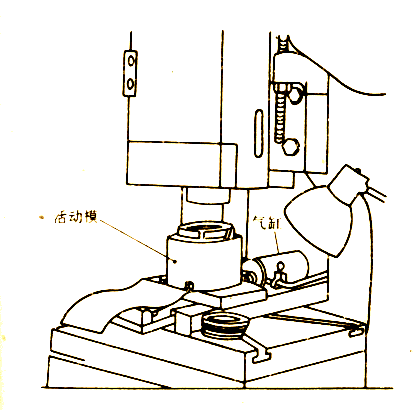 (1) 活動模 如圖13所示,操作時將沖制零件裝入凹模(此時凹模位置在凸模的外側)踩動腳踏開關時,先由氣缸的活塞桿把凹模拉入凸模下方,接著凸模下降,即行沖制。放開開關,沖頭回程,凹模立刻由活塞桿推出,取下沖制件,如此重復操作。也可采用旋轉式加料,將凹模旋轉到安全位置,放好坯料然后再旋轉到工作位置進行沖壓。